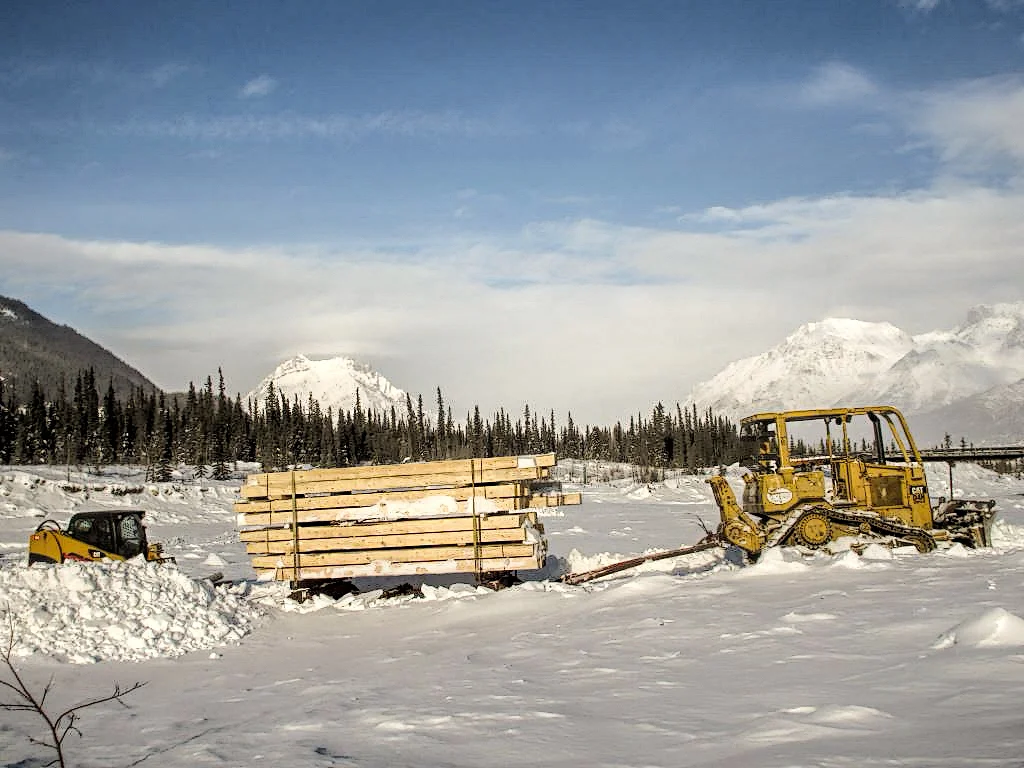 Rowcon Services freighting log cabin kit across Kennicott River, McCarthy area.